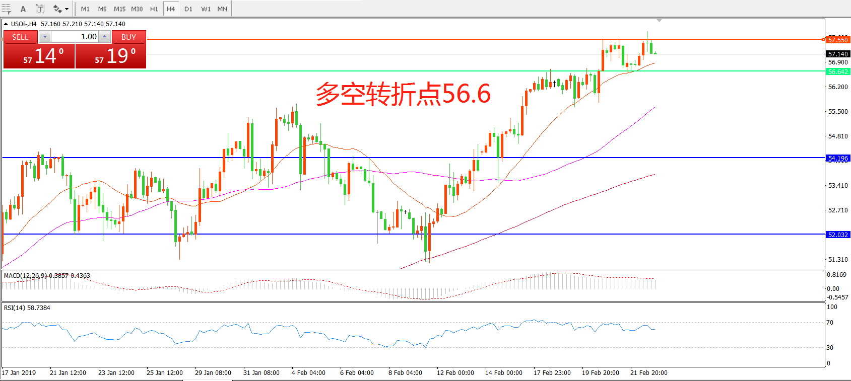 交易策略:在56.60 之上看涨,目标57.50 62.00