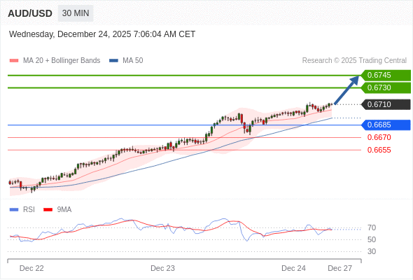 在 0.6685 之上,看涨,目标价位为 0.6730 ,然后为 0.6745 。