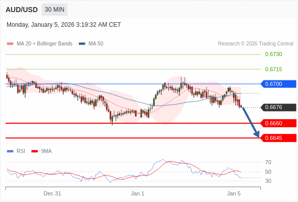 在 0.6700 之下,看跌,目标价位为 0.6660 ,然后为 0.6645 。