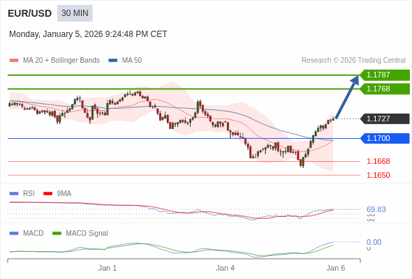 欧元/美元 当日内 : 看涨,当 1.1700 为支撑位。