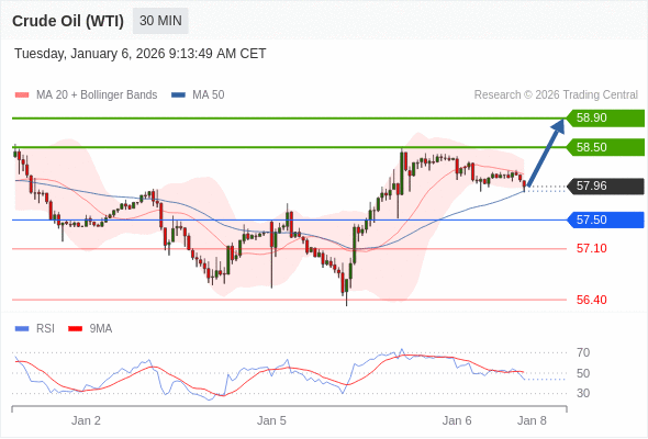 在 57.50 之上,看涨,目标价位为 58.50 ,然后为 58.90 。