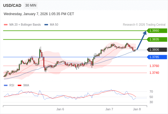 在 1.3785 之上,看涨,目标价位为 1.3835 ,然后为 1.3860 。