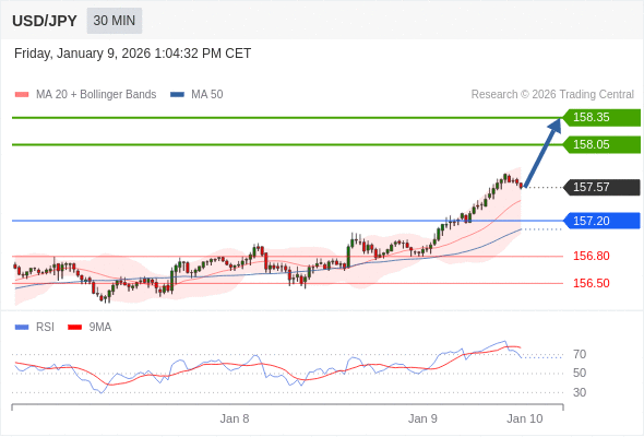 在 157.20 之上,看涨,目标价位为 158.05 ,然后为 158.35 。