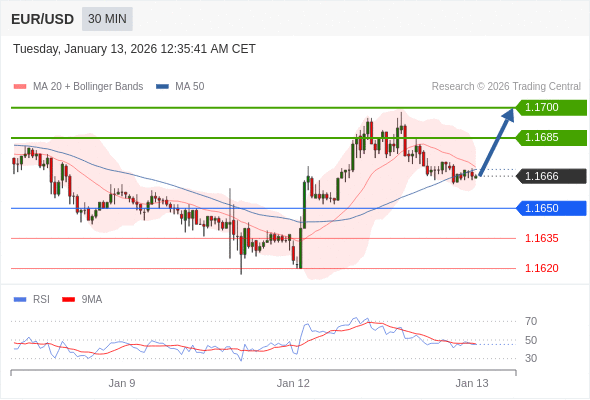 在 1.1650 之上,看涨,目标价位为 1.1685 ,然后为 1.1700 。