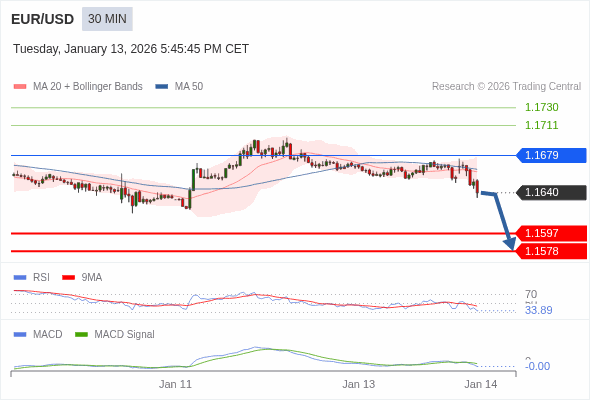 欧元/美元 当日内 : 看跌,在 1.1679 之下。