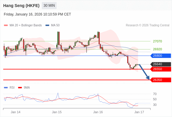 香港恒生指数期货 当日内: 下跌趋势。