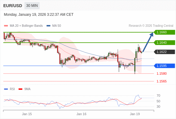 在 1.1595 之上,看涨,目标价位为 1.1640 ,然后为 1.1660 。