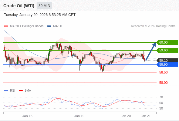 在 58.90 之上,看涨,目标价位为 59.60 ,然后为 60.00 。