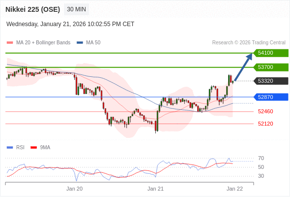 日经225股指期货 (OSE) 当日内: 在52870之上,看涨。