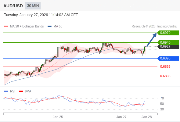 在 0.6890 之上,看涨,目标价位为 0.6940 ,然后为 0.6970 。
