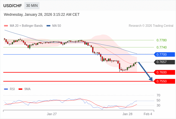 交易策略: 在 0.7700 之下,看跌,目标价位为 0.7600 ,然后为 0.7550 。