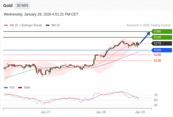 交易策略: 在 5220 之上,看涨,目标价位为 5330 ,然后为 5380 。