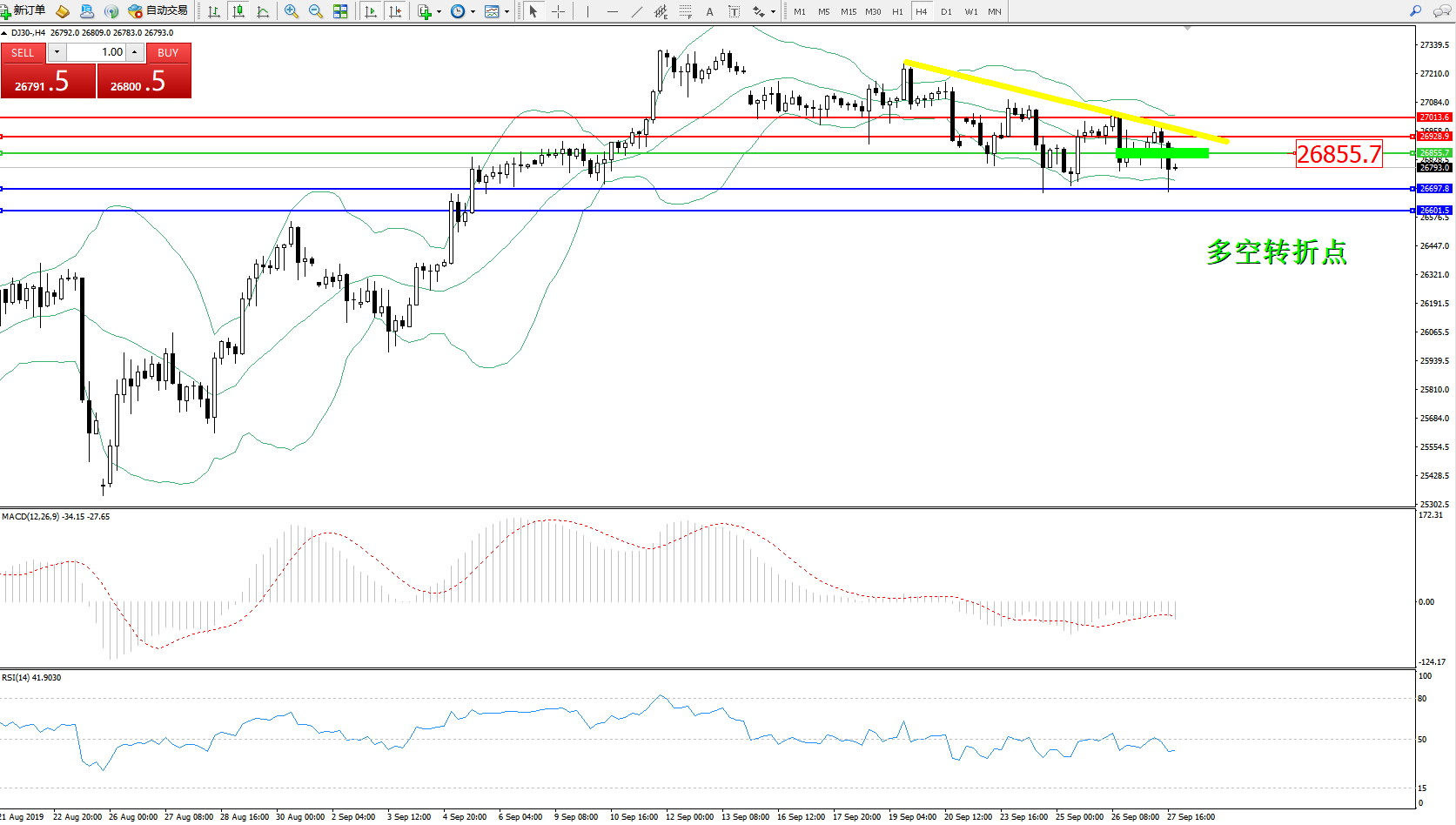 道琼斯指数9月27日(周五)收盘下跌70.90点,跌幅0.26%,报26820.25点。美国股市跌至三周低点,因紧张局势再度加剧。在本周的大部分时间里,股市都承受着压力,众议院周二开始对特朗普进行弹劾调查带来了最大的抛压。美国经济数据对道指几无影响,尽管数据显示8月个人收入和支出,以及耐用品订单初值都有所降温;只是美东时间上午11点后指数一度小幅下挫,因有关贸易局势的相关报道。