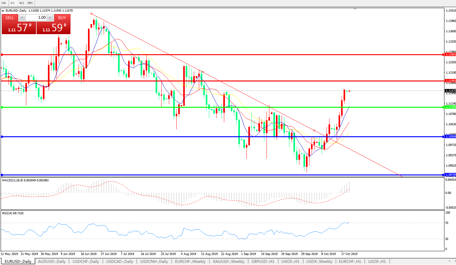 技术面简析:日图均线维持有序多头排列,汇价强势上行逼近1.1190关口,MACD上破0轴且量能0轴上放加速放量,RSI走高进入超买区域,预计短期汇价存进一步上行空间。