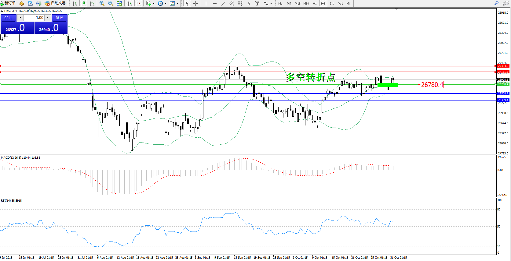 恒指HK50 ——4小时K线图显示: