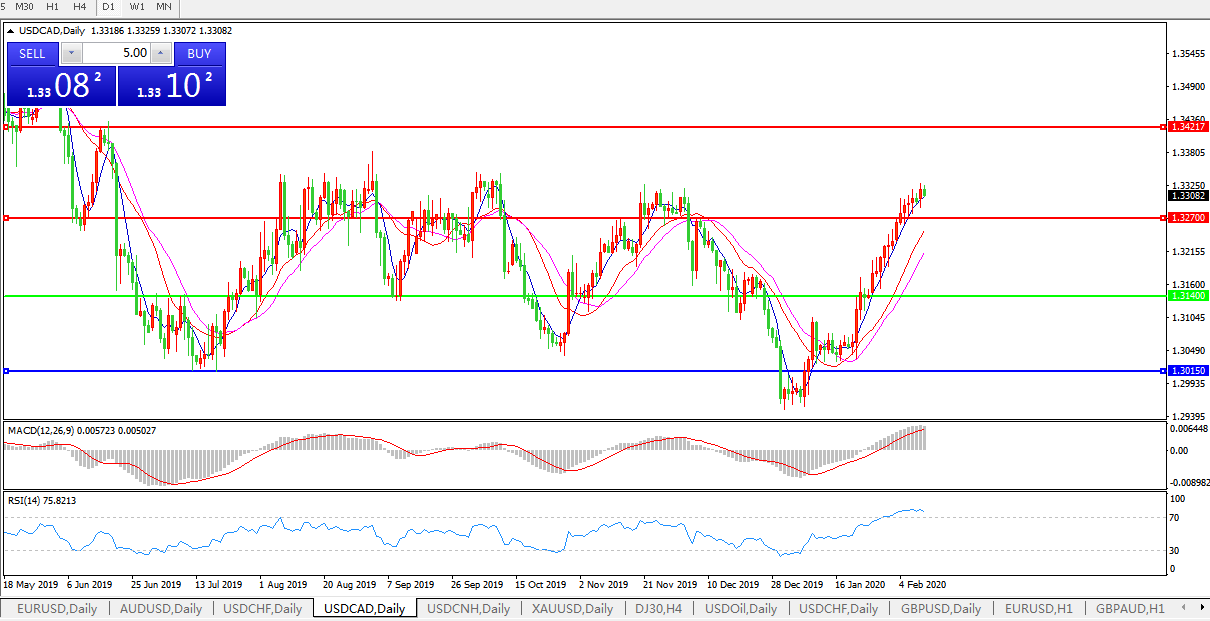 美元兑加元在上周五尾盘刷出自去年12月以来的两个月新高1.3320,原因在于全球风险情绪低迷,且油价持续疲软,令加拿大就业市场向好的状词变得黯淡无光。而周一日内,虽然加元汇价一度因油价企稳略有回升,令美元兑加元短暂跌回1.33下方,但在北美市场开盘在,美元兑加元汇价再度拉起; 原因一方面在于国际油价反弹动能仍然不足,令加元汇价面临的空头压力不减,一方面,全球突发卫生事件对经济的影响在周末过后经投资者再度咀嚼后,整体市场避险情绪仍唱主角,令商品系货币此前承受的下行压力继续存在;这令美元兑美元升回日高1.3316,并延续着开年以来的上行趋势,下一目标将是2019年四季度的高点1.3328。在OPEC+新一轮减产决定仍然难产,而需求损失却显而易见的背景下,美元兑加元后市料仍有续涨空间,有望继续上看去年9月的阶段高点1.3383。