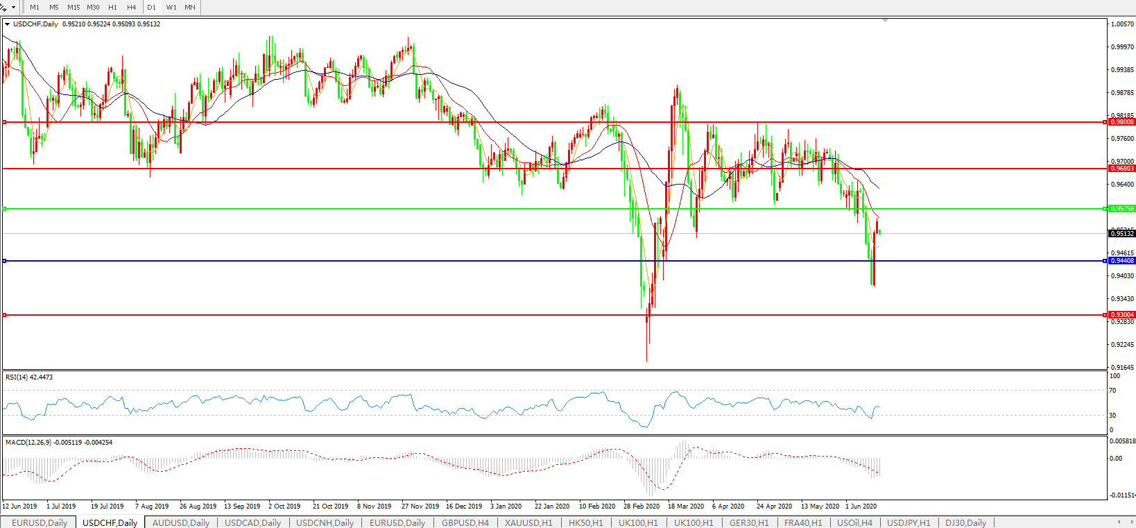 交易策略:0.9575下方看跌,目标0.9440、0.9300