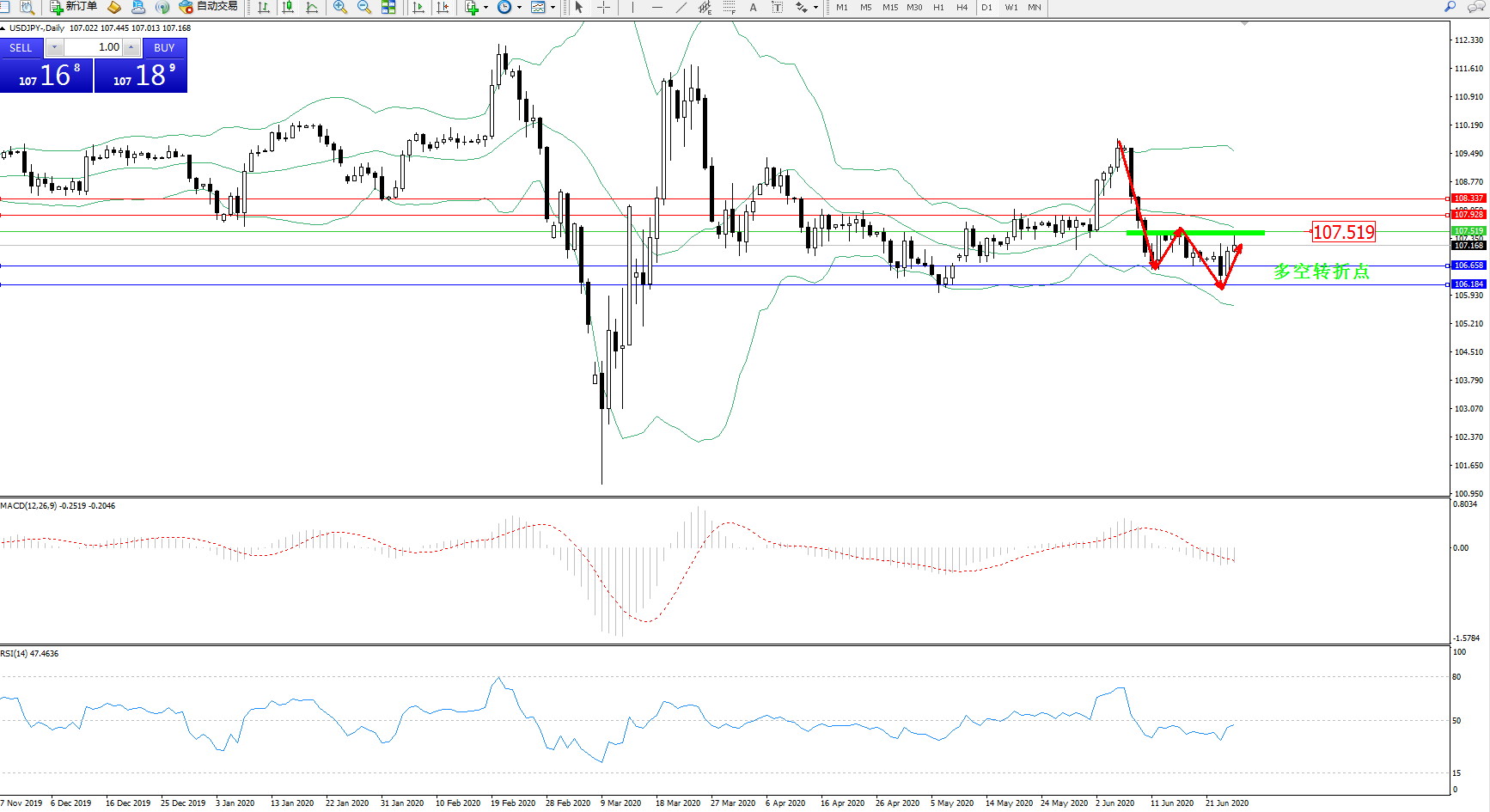 美元兑日元上涨0.14%107.19,此前升至616日以来高位107.45;成交量适中;日内尽管避险情绪升温,但在二次疫情压力上升的背景下,投资者依旧青睐美元,风险资产普遍承压,流动性风险担忧可能再度回归,美国新增病例数攀升降低了人们对经济快速复苏的信心,且美国正考虑对欧洲产品征收关税。美国有三个州近期疫情都呈现爆发之势,外加拉美地区和印度的疫情,市场避险情绪走高,但投资者似乎更青睐美元避险,今年美国经济或将出现V型复苏。