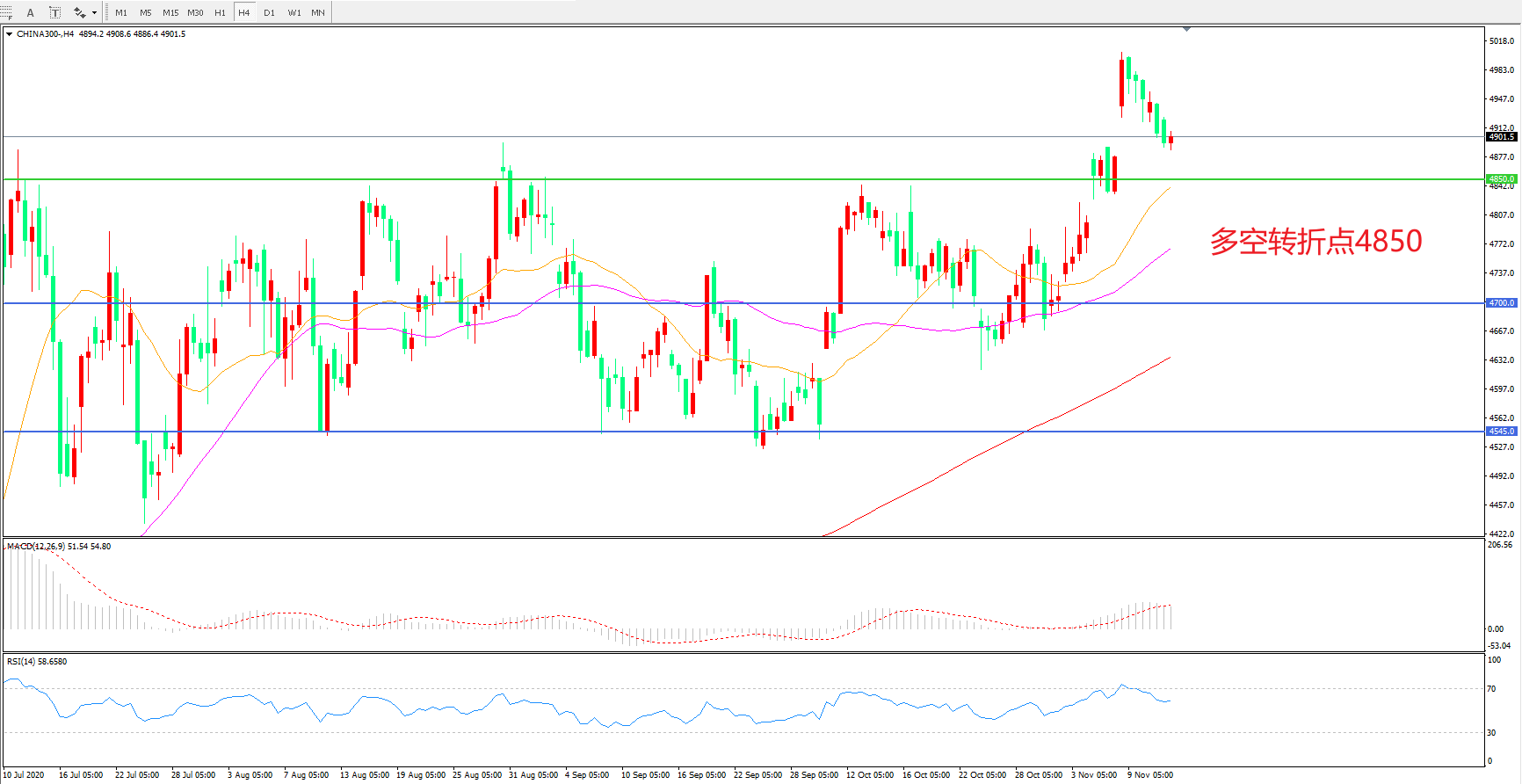 4小时图看,沪深300震荡下行,短期看有回补缺口的迹象,但均线系统依然成多头排列,MACD红柱增加,RSI指标向下,日内延续震荡概率较大。
