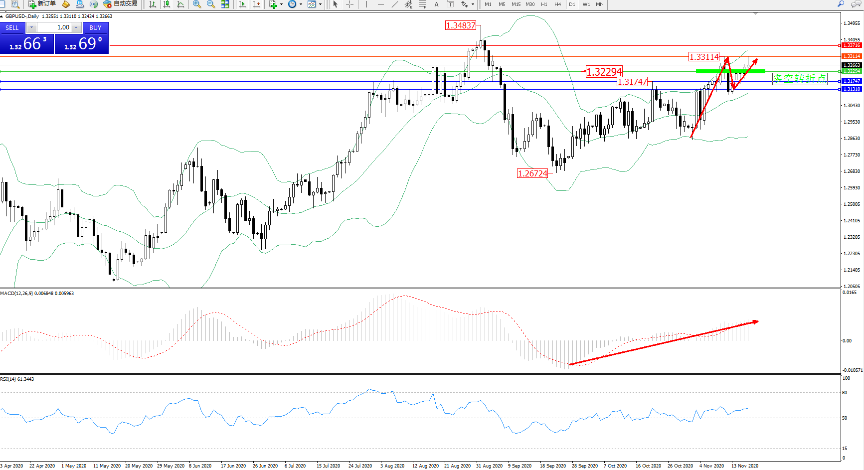 交易策略:1.32294上方看涨,目标1.33114、1.33716