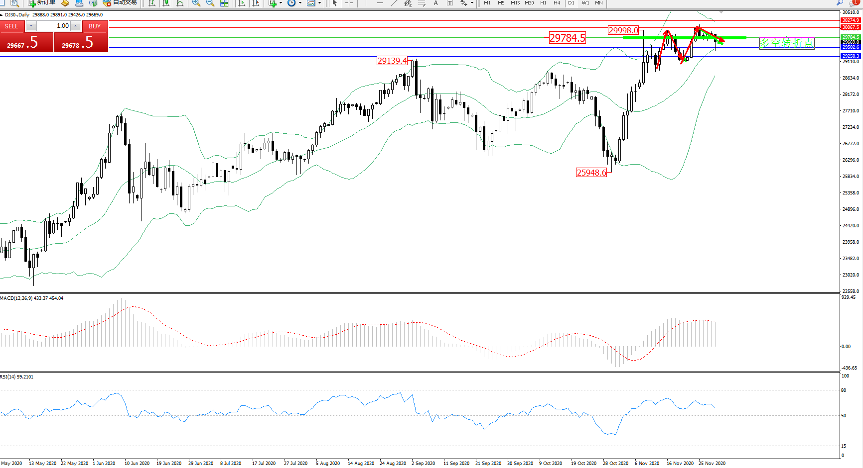 道琼斯指数11月30日(周一)收盘下跌271.10点,跌幅0.91%,报29639.30点。美股三大指数全部收跌,经过一个月的持续上涨之后,投资者开始评估风险资产的前景,导致美国股市周一从创纪录高点回落。但整个11月仍然创出4月以来的最佳月度表现;美国小盘股指数则创出历史最佳月度表现。市场广泛的抛售使道琼斯工业平均指数走低;美国10月成屋待完成销售连续第二个月下滑。美国10月成屋待完成指数意外较上月下降1.1%,至128.9。其他数据显示,美国中西部和德州工厂活动本月放缓。11月芝加哥采购经理人指数从10月的61.1降至58.2。因全国范围内新增病例数飙升抑制新订单,并干扰生产。美元只是暂时得到提振,疲软显然仍是较长期趋势。市场参与者仍然乐观地认为,美国当选总统拜登的政府不会对全球经济增长构成什么障碍,且美联储可能提供额外货币政策支持。这两个因素都应该会降低美元的避险吸引力。