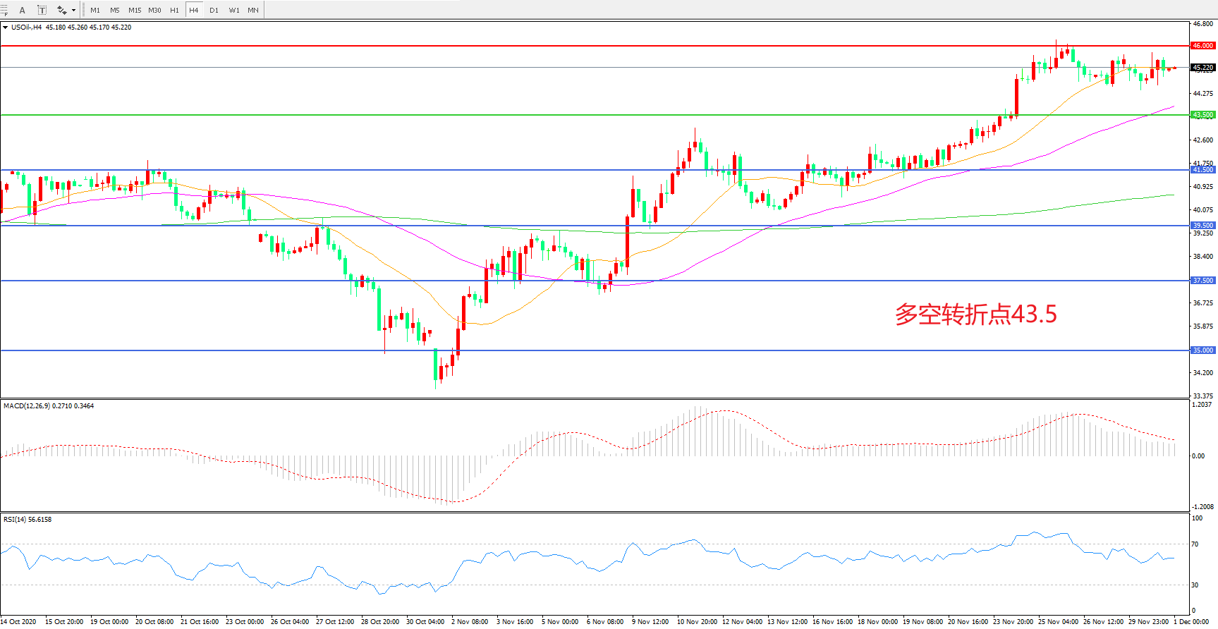 周二(12月1日),由于OPEC+重磅产量会议陷入僵局,油市乐观情绪遭到打压,美国WTI原油震荡走低,收报44.11美元/桶。目前来看,市场仍然在等待OPEC会议结果,如果非OPEC成员国能够同意延长减产协议,那么OPEC很有可能将减产协议延长至2021年的第一季度,这将直接决定原油价格近一段时间的走势。