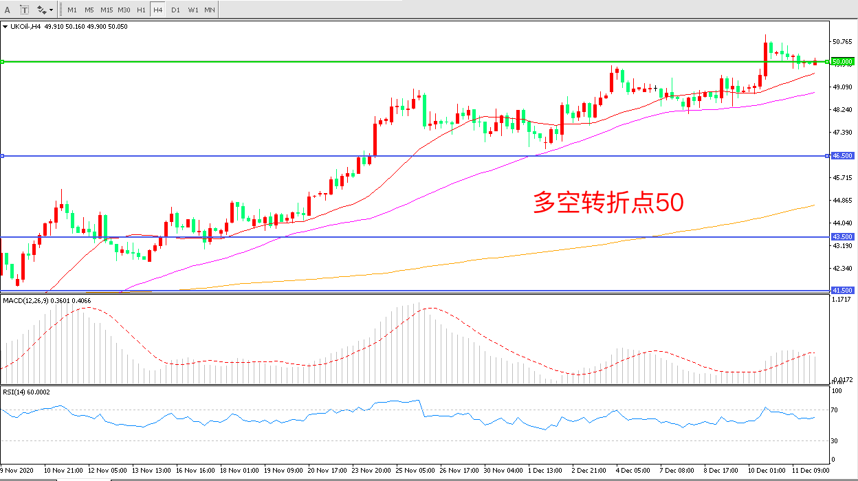 4小时图看,油价长阳突破后出现小幅回调,短期波幅不大均线系统成为短期支撑50美元成为多空分水岭MACD红柱减少,RSI指标走平,日内延续震荡概率较大。