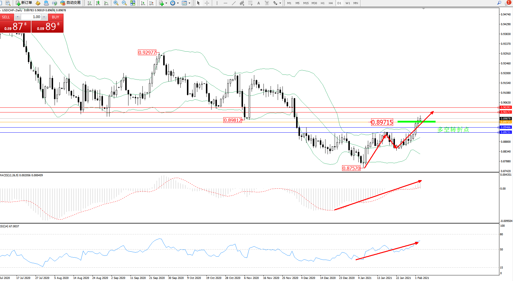 交易策略:0.89715上方看涨,目标0.90172、0.90393