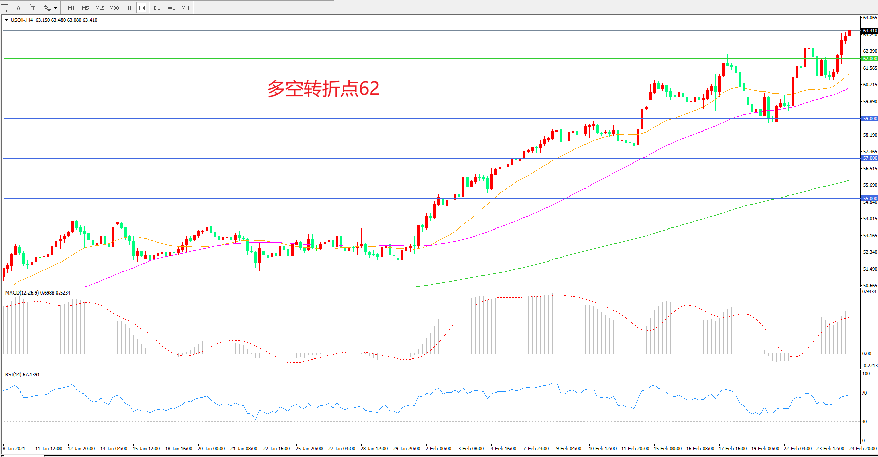 交易策略:在62.00之上看涨,目标65.00 68.00
