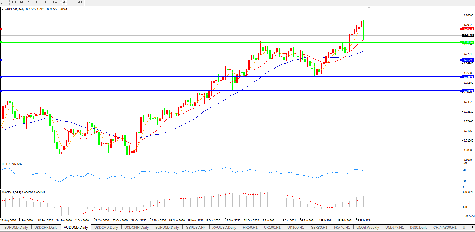 交易策略:0.7800上方看涨,目标0.7900、0.8000