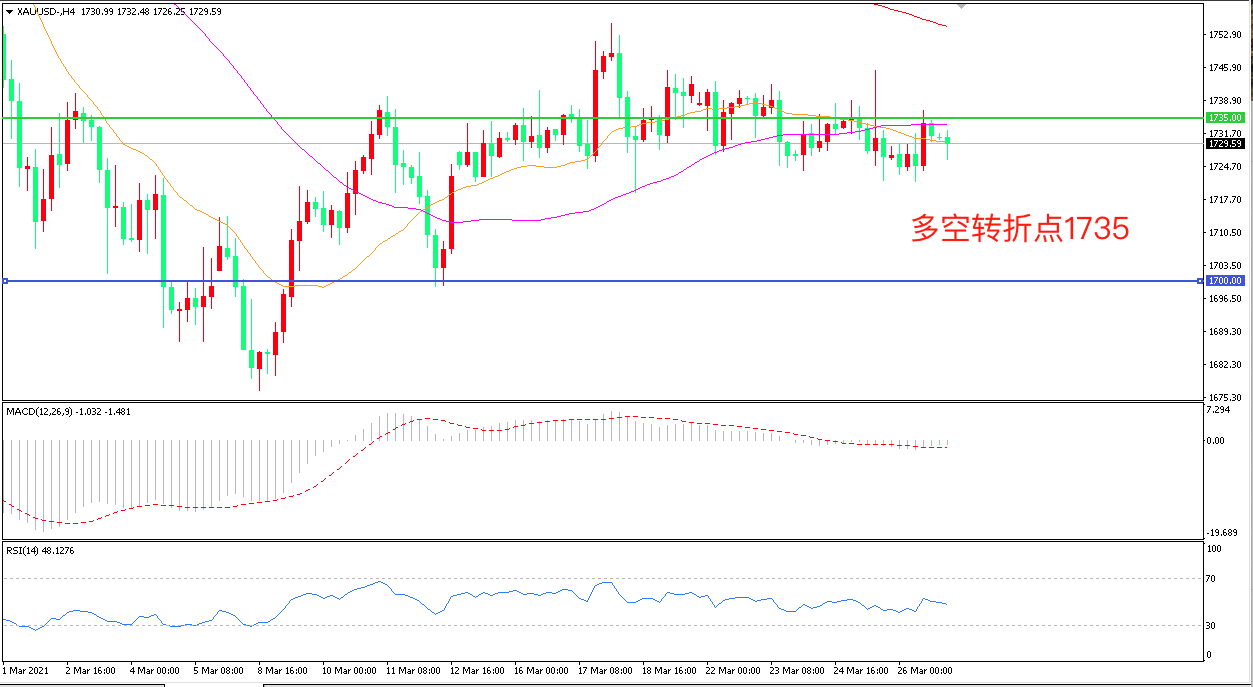 4小时图看,金价延续低位震荡整理,整体波幅较小,200周期均线逐渐下压,1735成为短期多空分水岭,MACD绿柱增加,RSI指标走平,日内延续震荡概率较大。
