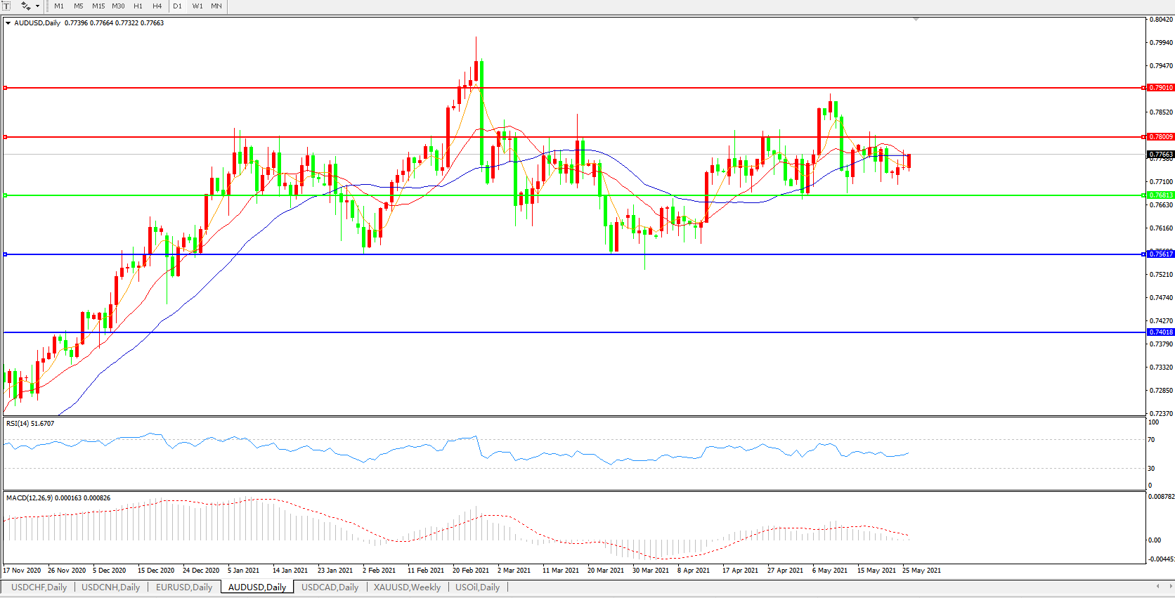 备选策略:0.7680下方看跌,目标0.7560、0.7400
