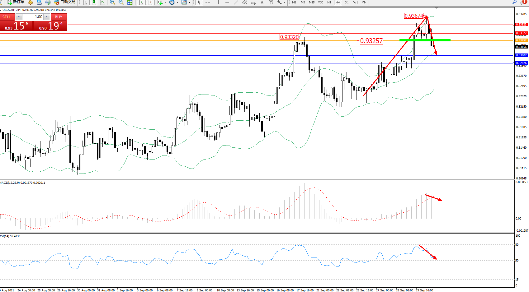 交易策略:0.93257下方看跌,目标0.93007、0.92876