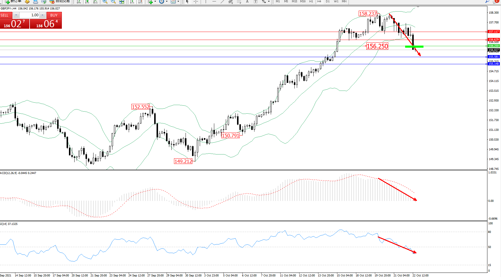 交易策略:156.250下方看跌,目标155.581、155.148