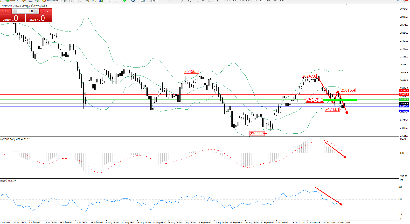 技术点评:空头动力延续布林带指标中下轨区间持续震荡下行态势良好,低位抵达24743位置得到支撑反转上移,但整体下行趋势依旧,短期未见最终止步迹象,布林带指标呈收口走势后开始缓慢张口向下移动,MACD指标空头动力维持震荡下行至0轴线下方整理,RSI指标维持在50均衡线下方空头区域弱势整理下行;