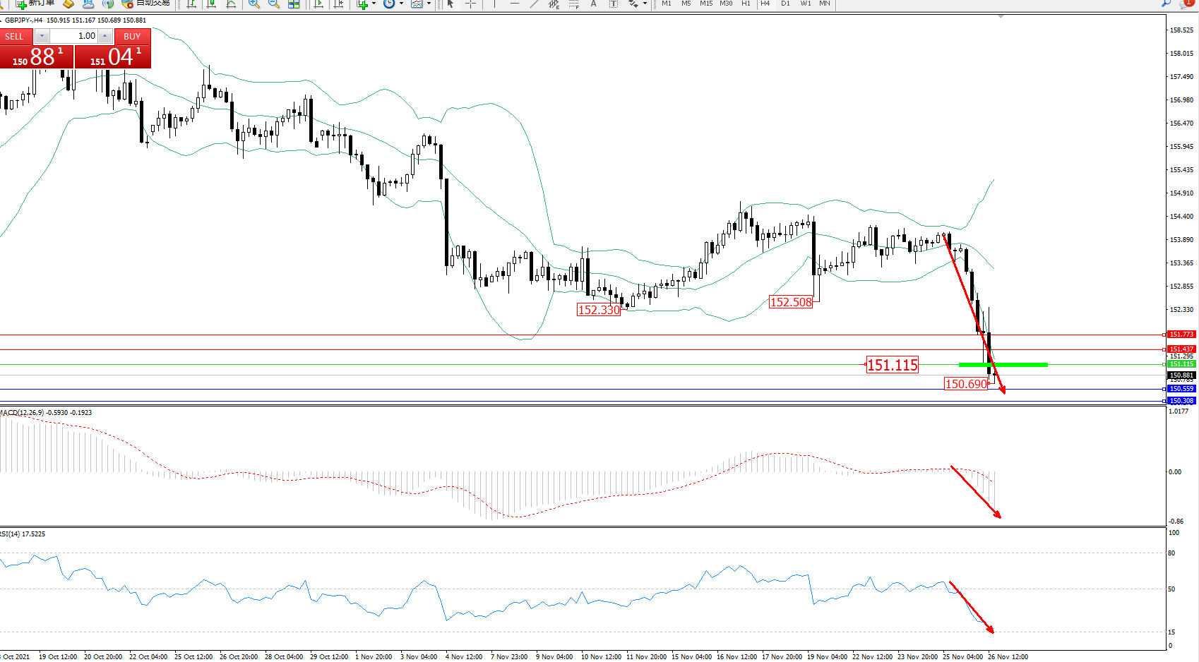 技术点评:空头动力延续布林带指标下轨附近持续震荡下行,低位抵达150.690附近开始震荡,短期空头动力有继续下行态势,且未见有止步迹象,布林带指标呈张口走势良好,MACD指标处于0轴线下方空头区域维持震荡下行,RSI指标处于空头区域不断震荡下行即将触及超卖区15均衡线位置;