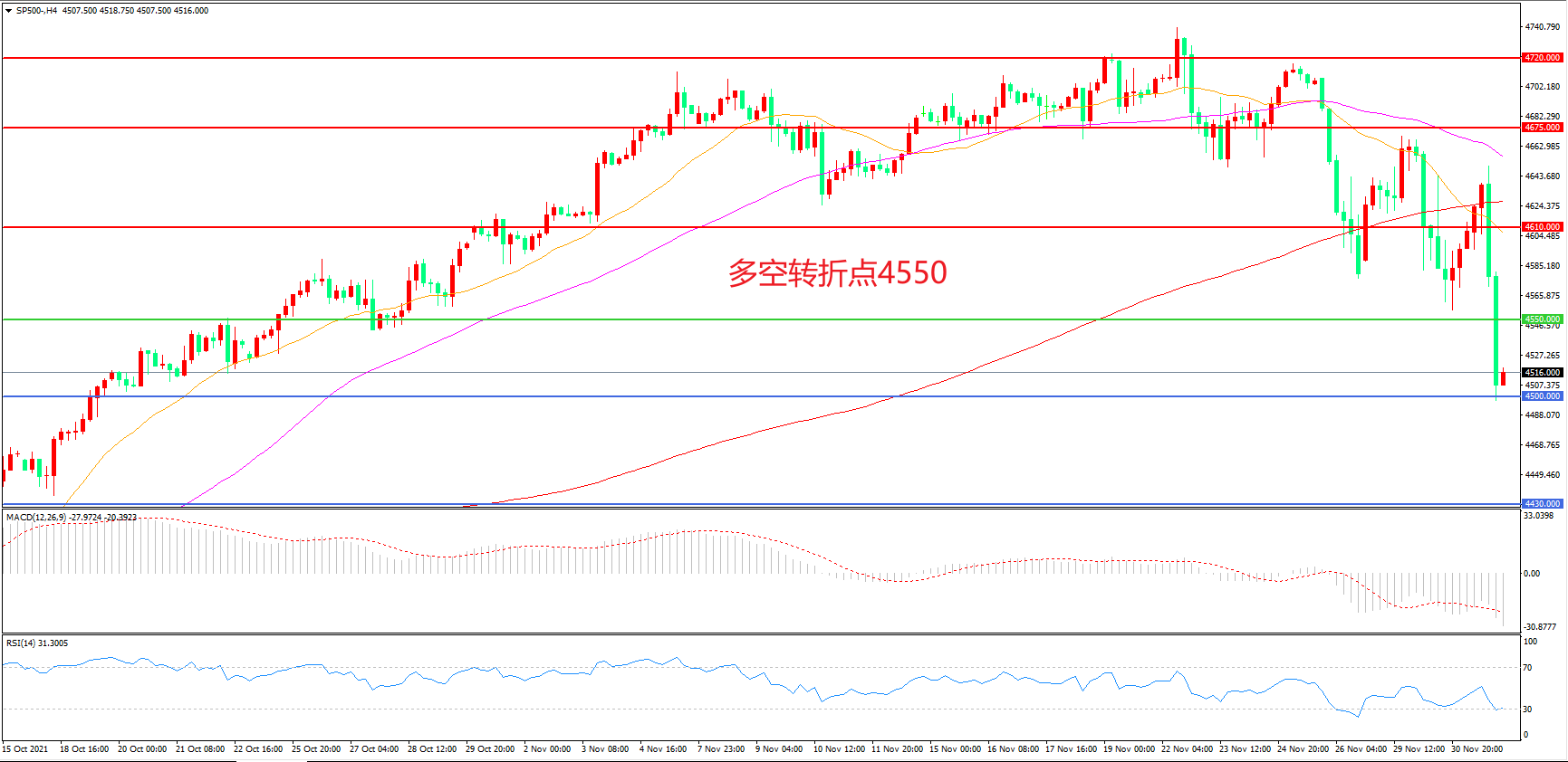 4小时图看,标普500连续下破,短期走势偏空,均线系统拐头向下,MACD绿柱增加,RSI指标走平,日内震荡下行概率较大。