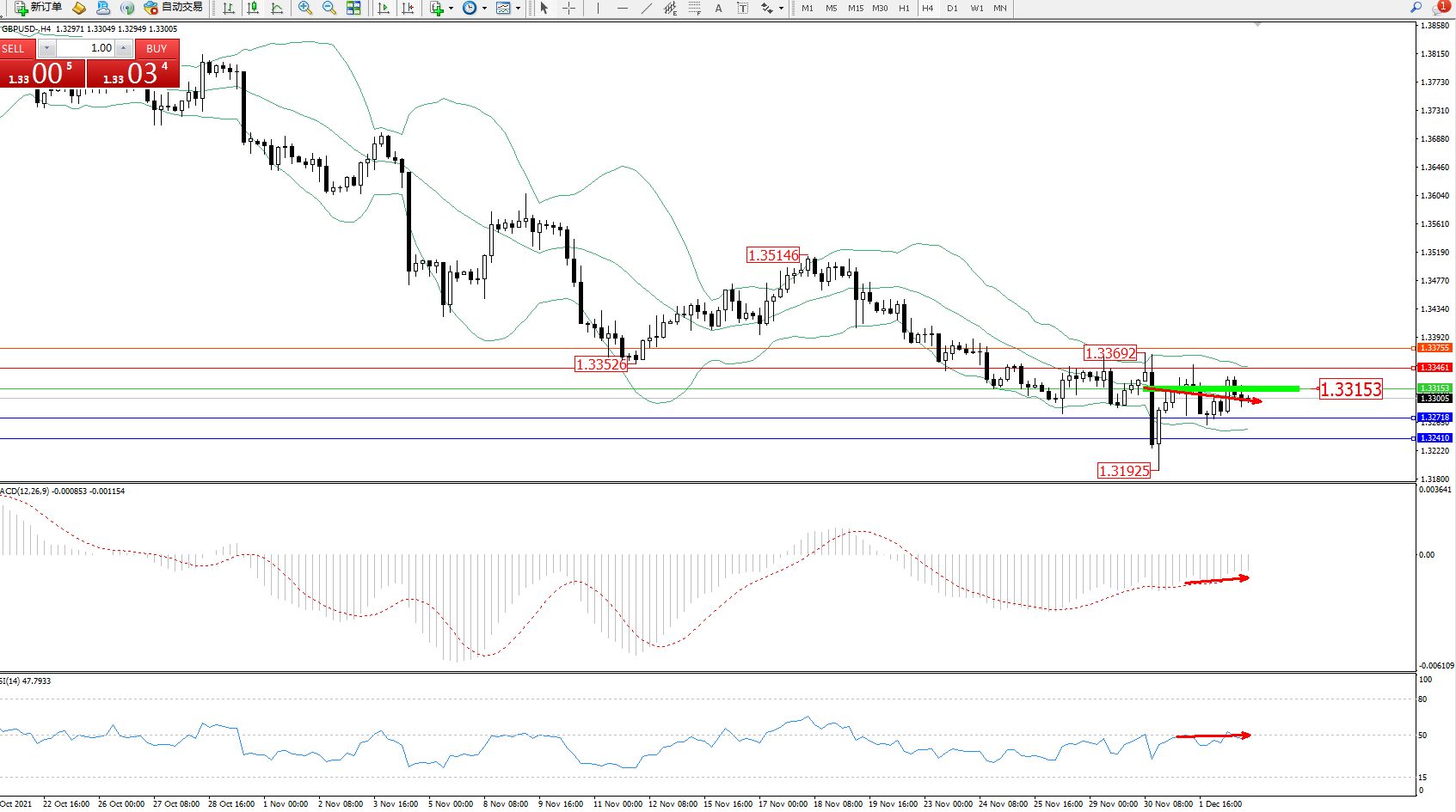 交易策略:1.33153下方看跌,目标1.32718、1.32410