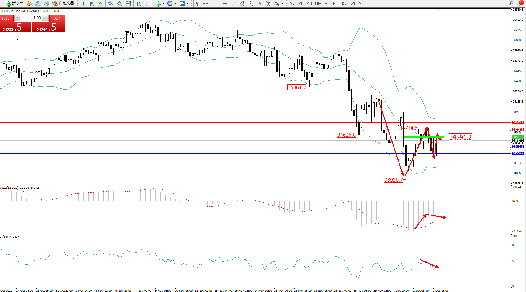 交易策略:34591下方看跌,目标34443、34336