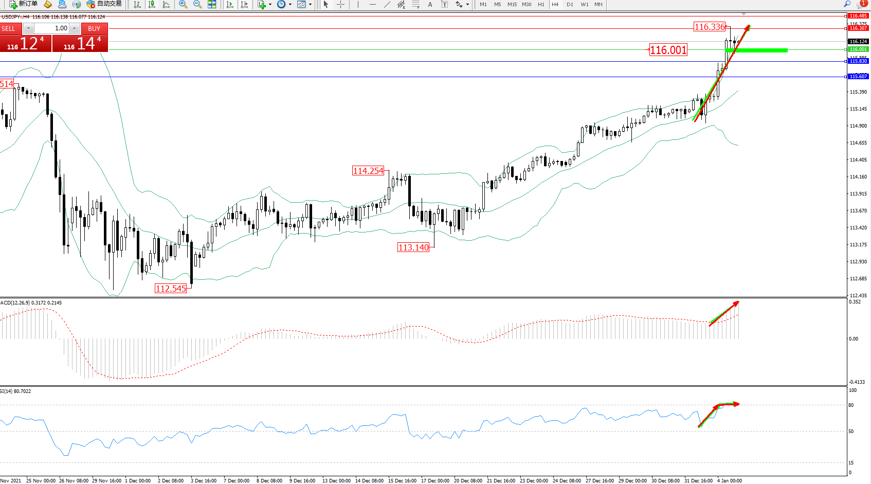 交易策略:116.001上方看涨,目标116.307、116.485
