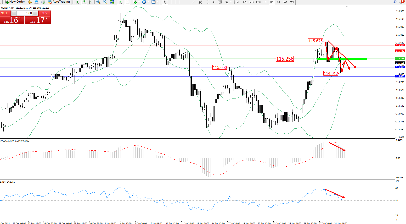 交易策略:115.256下方看跌,目标115.050、114.838