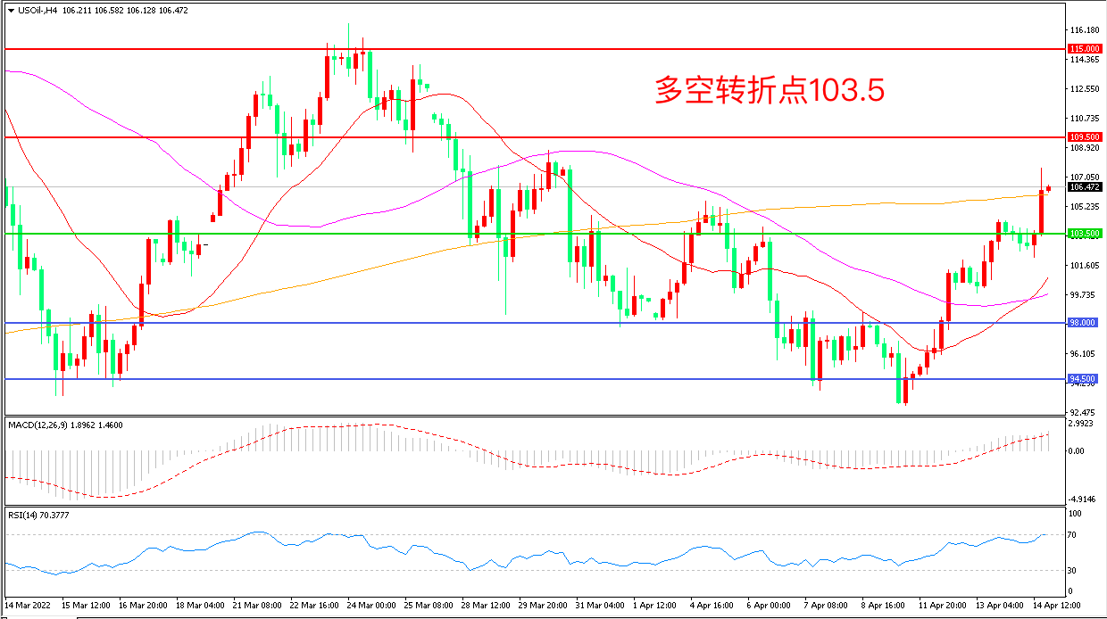 周四(4月14日),有报道称,欧盟正朝着逐步实施俄罗斯石油禁令的方向前进,俄乌谈判局势恶化加强了原油市场断供的担忧,美国WTI原油大幅拉升,收报106.47美元/桶。受4月15日耶稣受难日影响,美国原油合约将休市一日,中期看油价易涨难跌。