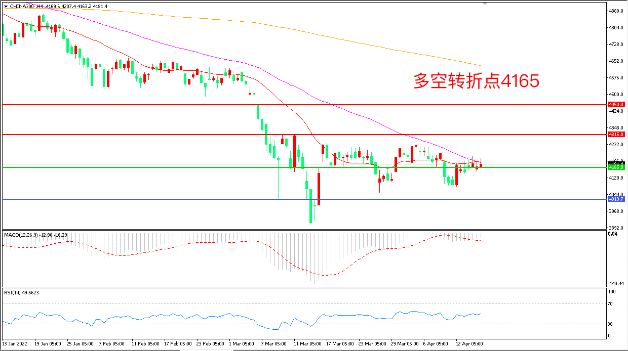 4小时图看,沪深300延续低位震荡,但整体仍受制于55周期均线,4165成为多空分水岭,MACD绿柱增加,RSI指标走平,日内震荡下行概率较大。