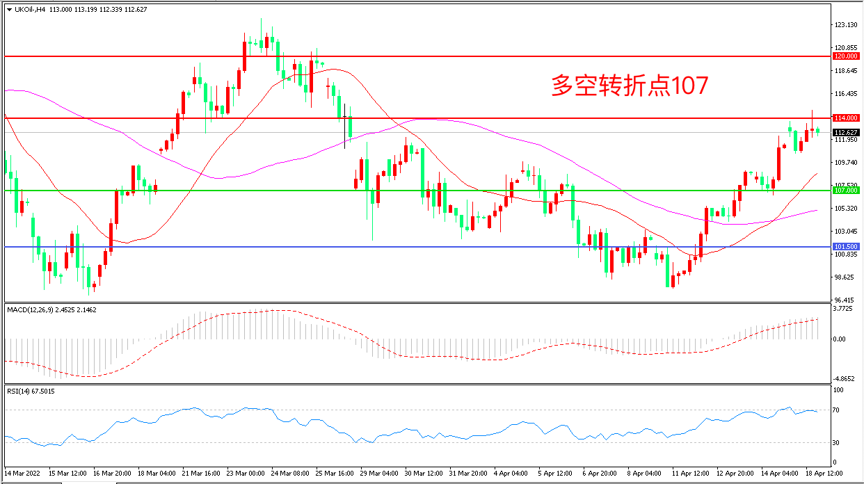 4小时图看,油价以107美元为依托连续拉升,短期走势偏强,短期均线拐头向上,MACD红柱增加,RSI指标走平,日内震荡上行概率较大。