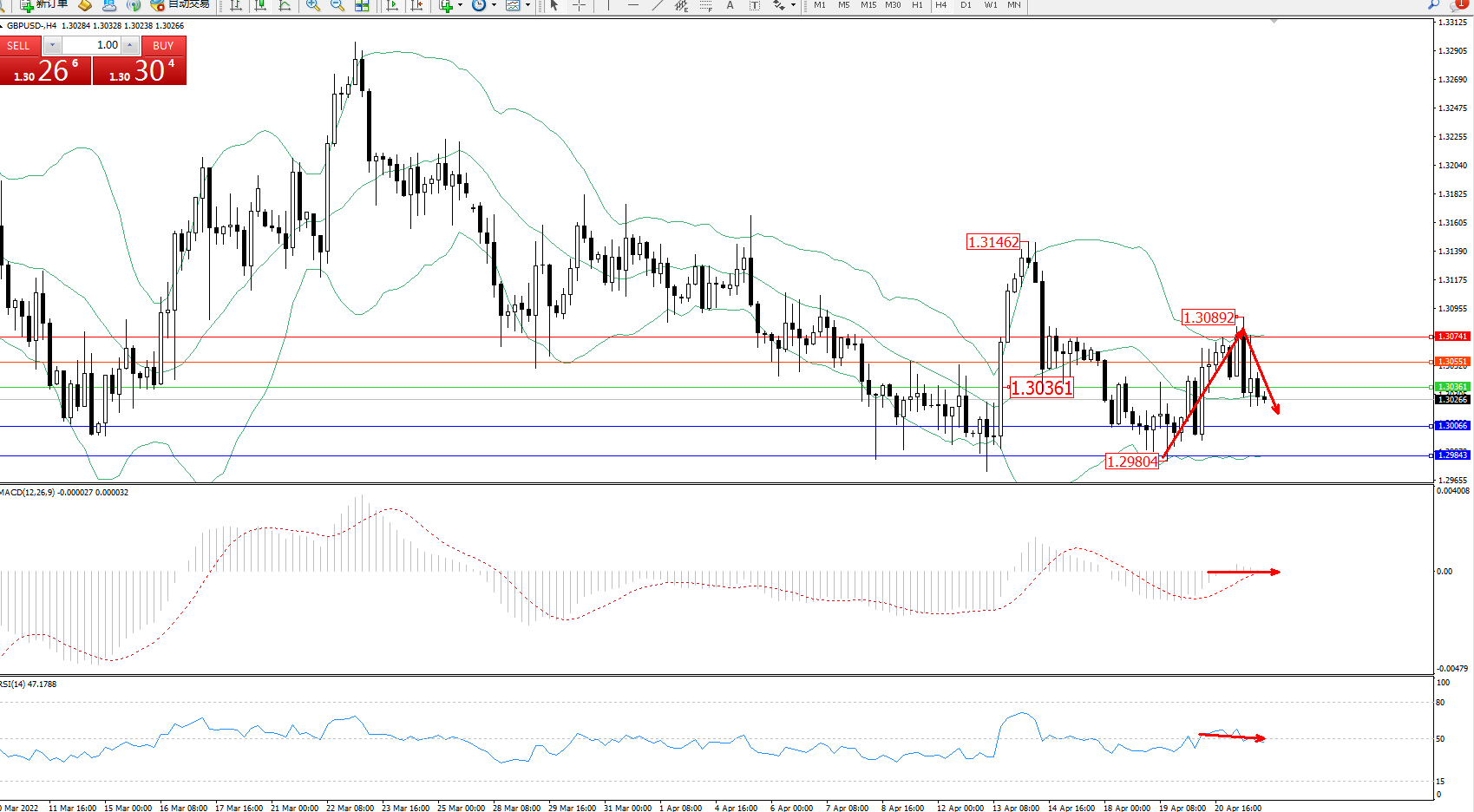 交易策略:1.30361下方看跌,目标1.30066、1.29843