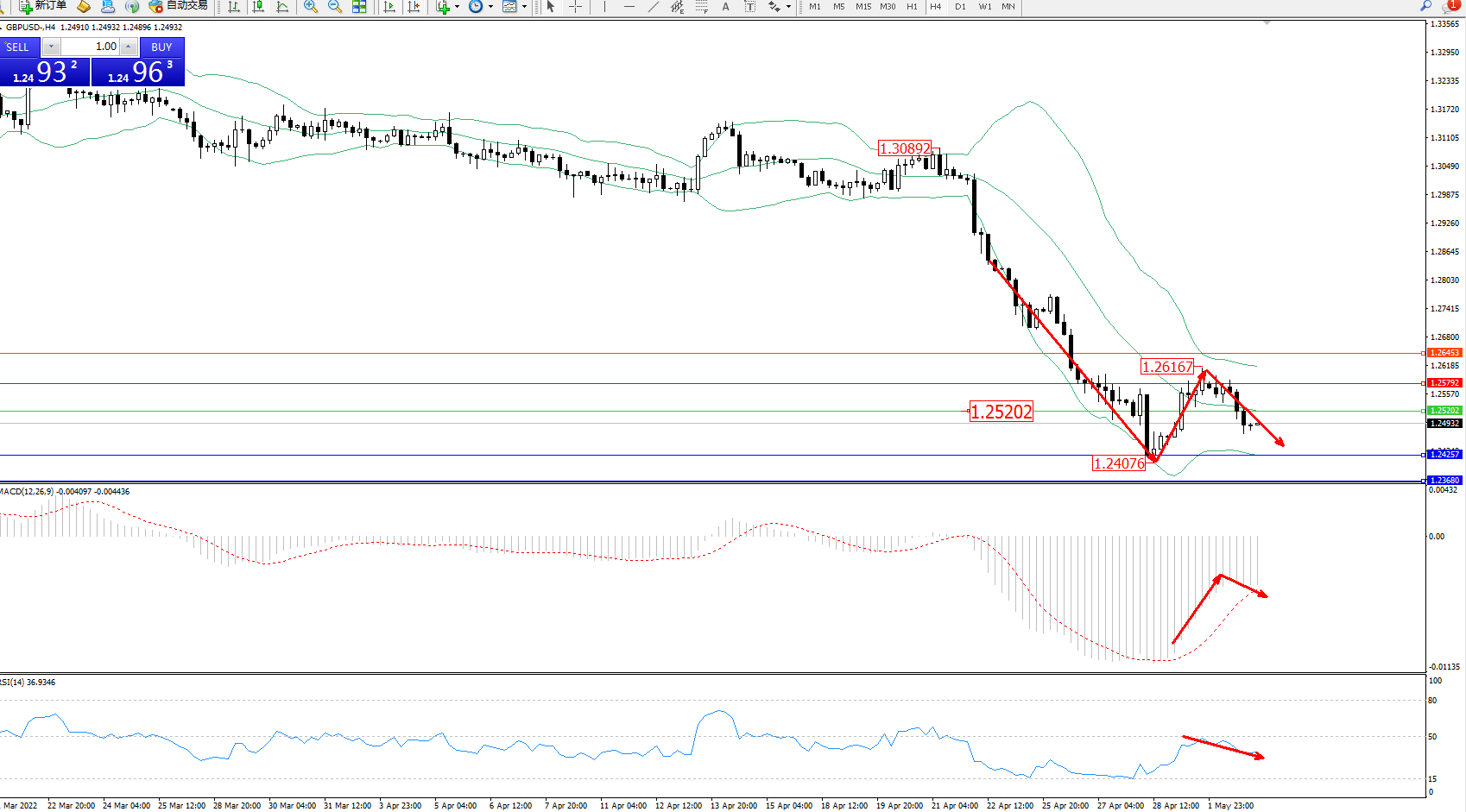 交易策略:1.25202下方看跌,目标1.24257、1.23680