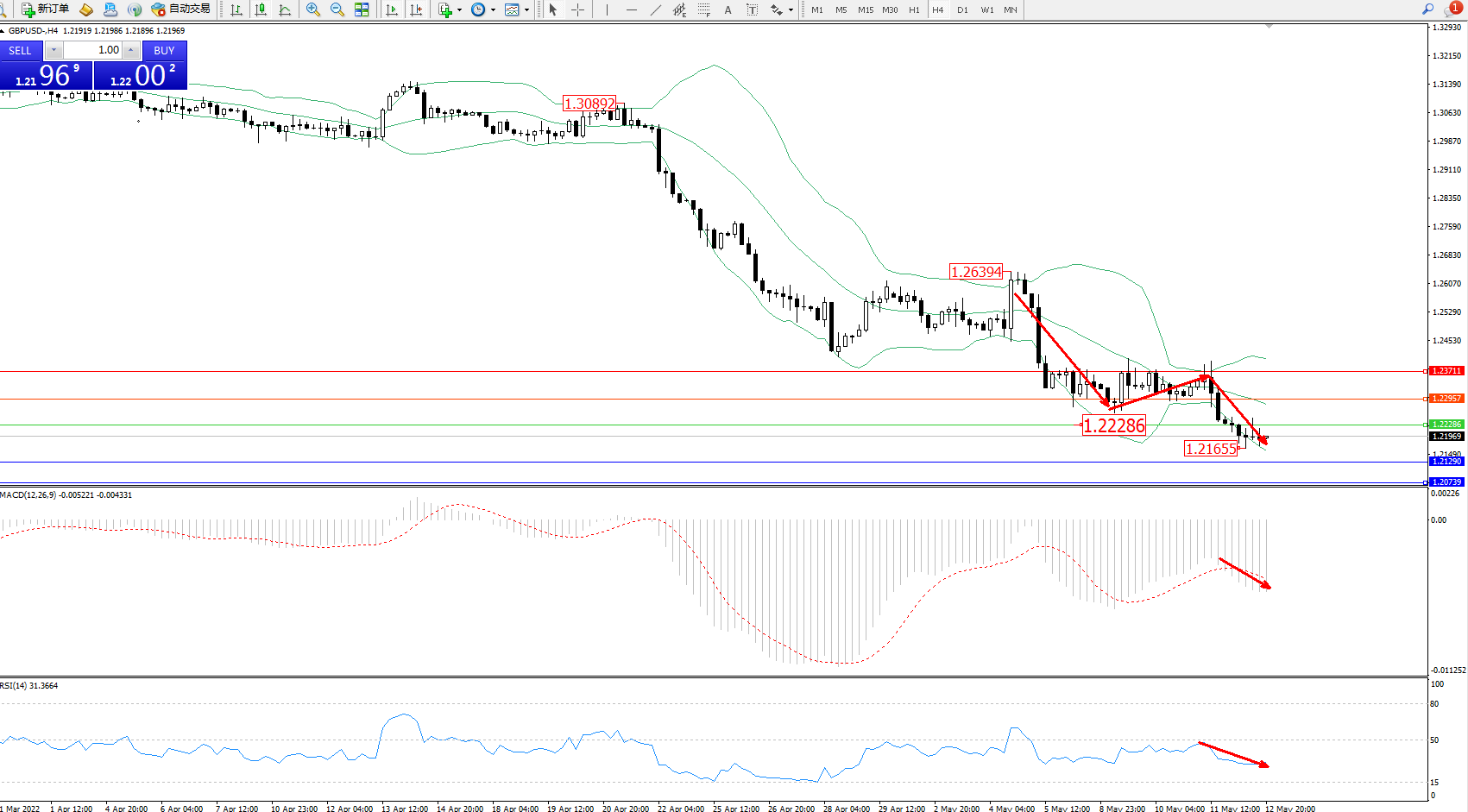 交易策略:1.22286下方看跌,目标1.21290、1.20739
