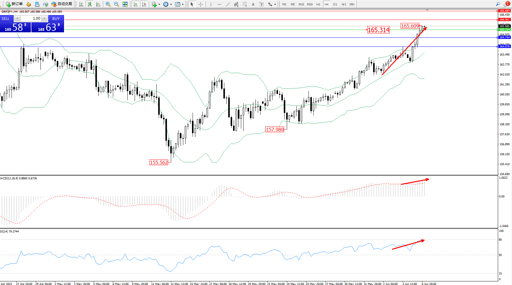技术点评:多头动力延续布林带指标通道中上轨区间持续震荡上扬,高位抵达165.609附近震荡,布林带指标呈上行趋势拉升后开始有张口迹象,MACD指标处于多头区域维持震荡不断上移,RSI指标处于多头区域维持震荡上移至80均衡线下侧徘徊;