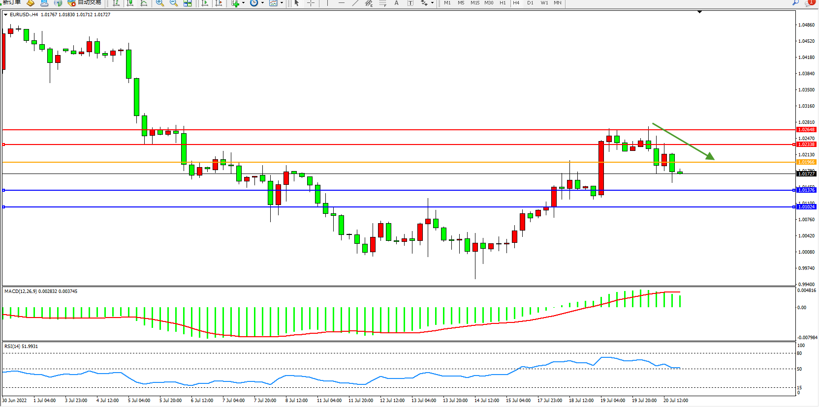 欧元兑美元维持1.01727附近震荡, 欧洲央行决策者可能考虑在本周四的政策会议上加息50个基点,高于他们6月份暗示的加息25个基点。紧缩步伐快于预期的前景令欧元投资者感到宽慰。