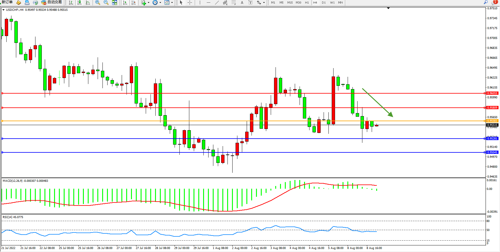 美元瑞郎USDCHF——4小时K线图显示: